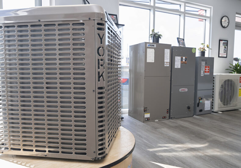 Exposition de systèmes de chauffage et de climatisation, incluant une thermopompe York et des unités intérieures de marques variées.Nos conseils